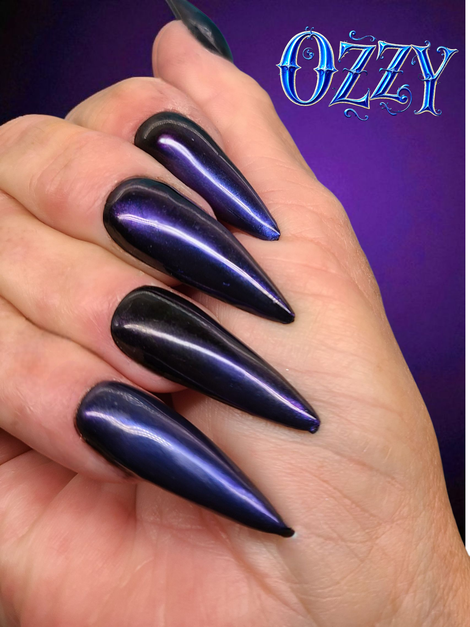 "Indulge in a tribute to the Prince of Darkness, Ozzy Osbourne ,with OZZY. This luxurious chameleon dip powder features a bold blend of purple and black, with glimmers of blue in certain lighting. Exuding depth and drama, this highly pigmented powder is sure to elevate any manicure."